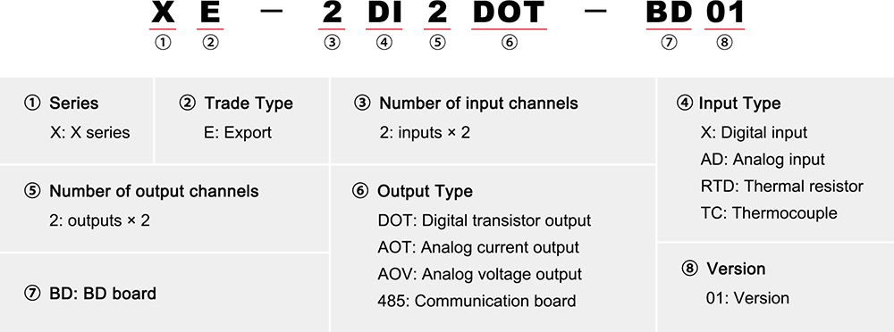 | 1 | Xe-2di4dot-bdo1 | 2di/4do transistor, 24vdc | Digital Inputs × 2 & Transistor Outputs × 4 |