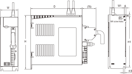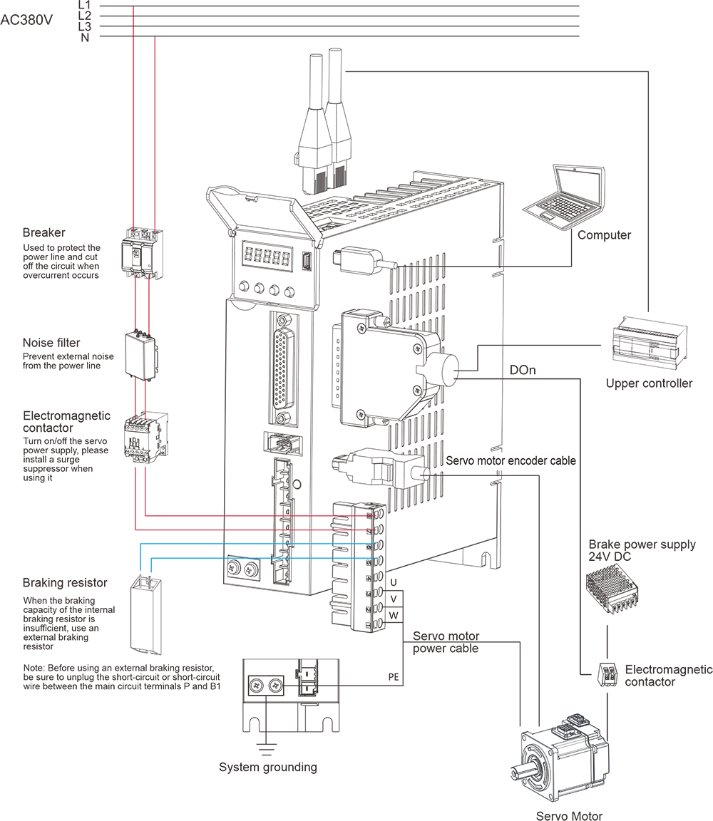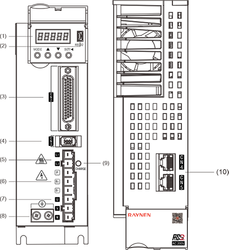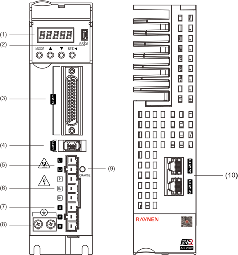 | Paglalarawan: ① -: pitong -segment na digital na display ②Mini USB: RS232 interface, na konektado sa PC ③CN2: Output/Input Signal Connector, na konektado sa Programmable Controller (PLC) o Kontrol I/O ④cn3: Interface ng Encoder, na konektado sa encoder sa motor ng servo ⑤L1, L2: Pangunahing Circuit Power Supply, na konektado sa Single-Phase Power Supply (200 ~ 240VAC, 50/60Hz Power Supply) ⑥Brake: Gumamit ng panlabas na risistor ng preno ⑦u, v, w: servo drive output, konektado sa motor power connector (u, v, w) ⑧ground Screw: Kumonekta sa power ground at motor ground ⑨CHARGE: ilaw ng tagapagpahiwatig ng kuryente ⑩CN4/CN5: 485 Port ng komunikasyon | |||