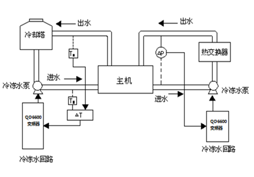 | 04 Panimula ng System: Sa sistemang ito, ang dalawang 110kW na pinalamig na mga bomba ng tubig ay hinihimok ng dalawang D71 110kW inverters, at mayroon ding ilang mga D71 inverters na nagtutulak ng mga tagahanga (kabilang ang mga panloob na tagahanga at mga tagahanga ng paglamig ng tower). Sa pinalamig na sistema ng sirkulasyon ng tubig, ang signal 1 (signal signal o signal ng presyon) ng circuit ng inlet ng tubig at ang signal 2 (signal signal o signal ng presyon) ng circuit outlet circuit ay ipinadala sa analog module upang makuha ang analog feedback signal ng inverter. Sa pamamagitan ng built-in na PID function ng inverter, natanto ang closed-loop awtomatikong kontrol. | | ||||||||||||||||||